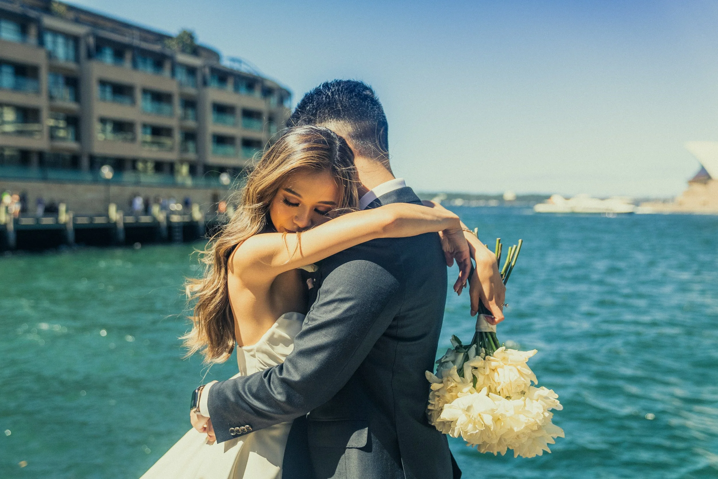 A bride and groom embrace by the water, with the bride holding a bouquet of white flowers and the groom dressed in a gray suit.