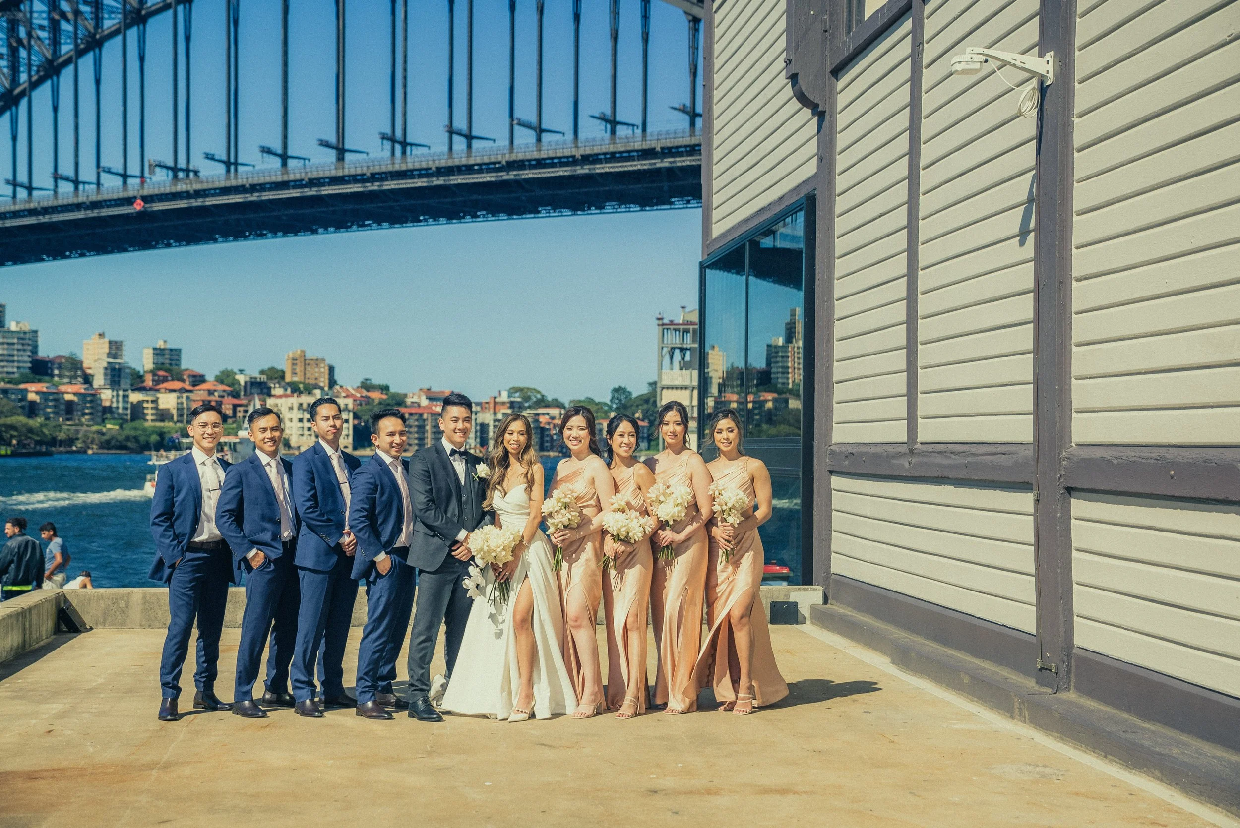 A wedding party posing outdoors near a river with a bridge and cityscape in the background. The group includes men in blue suits and women in beige dresses, with some holding bouquets of white flowers.