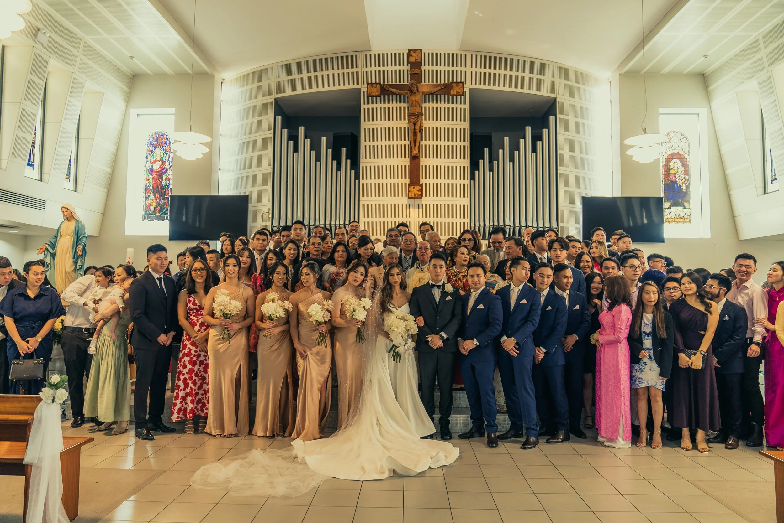 A large group of people gathered in a church for a wedding, with the bride and groom at the center, surrounded by family and friends, in a brightly lit sanctuary with stained glass windows and a large cross.