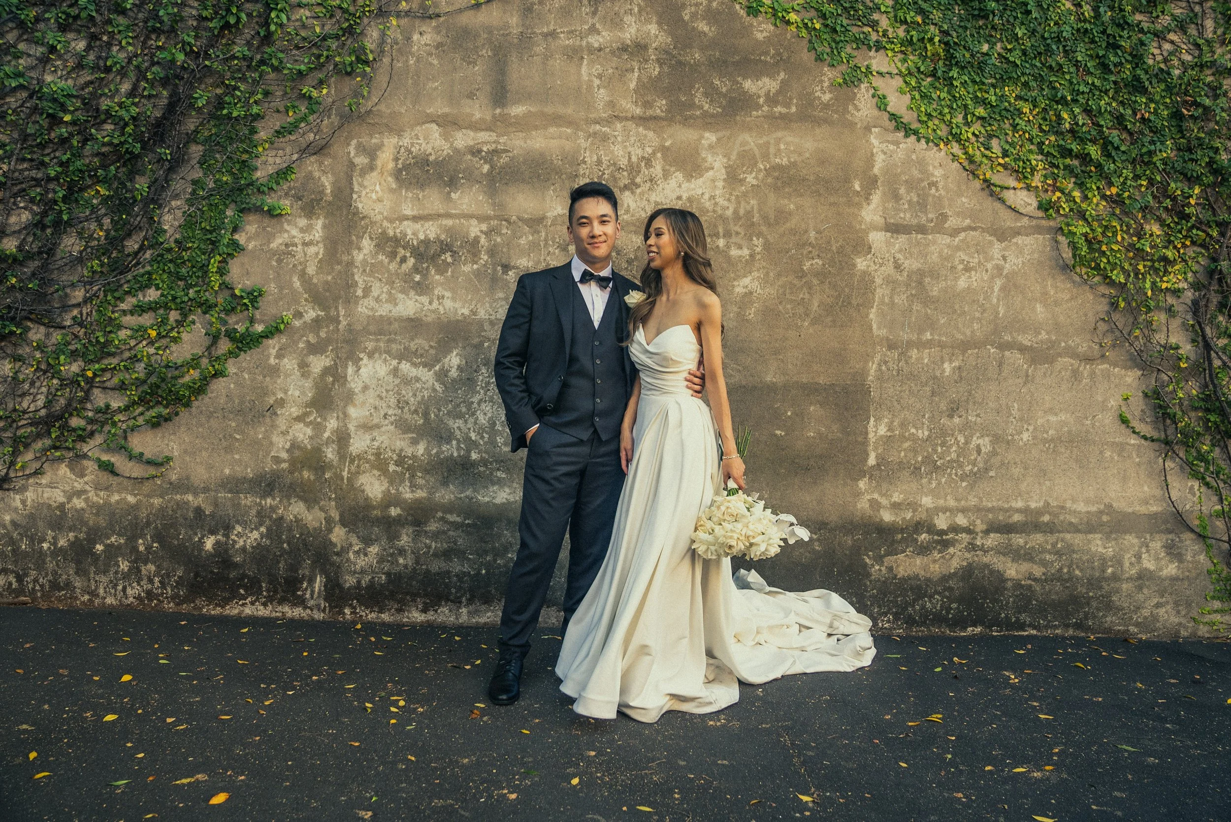 A newlywed couple standing in front of a textured concrete wall with green ivy leaves. The groom is wearing a dark navy suit with a bow tie, and the bride is in a strapless white wedding gown holding a bouquet of white flowers.