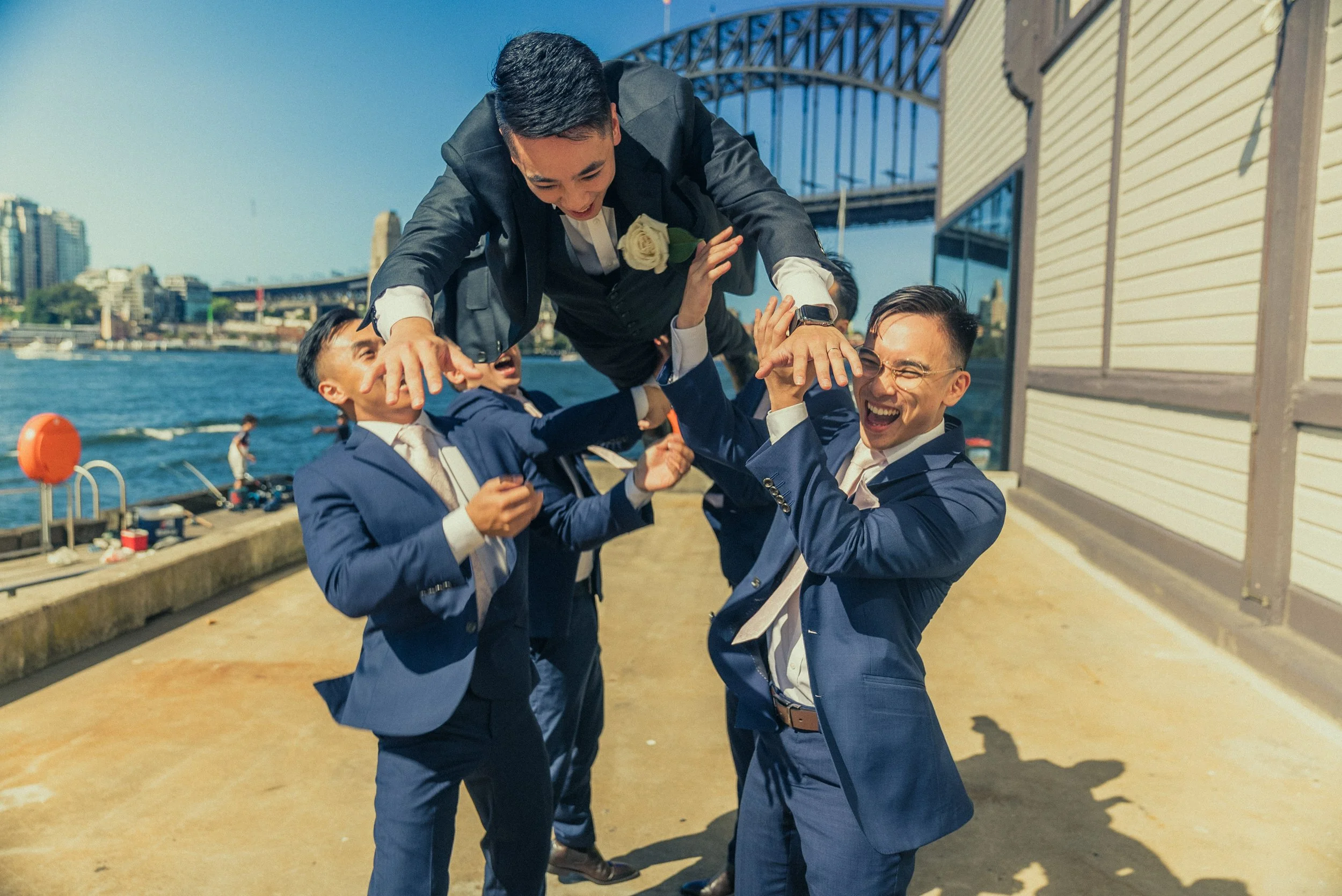 A group of men in suits lifting another man in a suit into the air outdoors near a body of water, all smiling and appearing happy and celebratory.