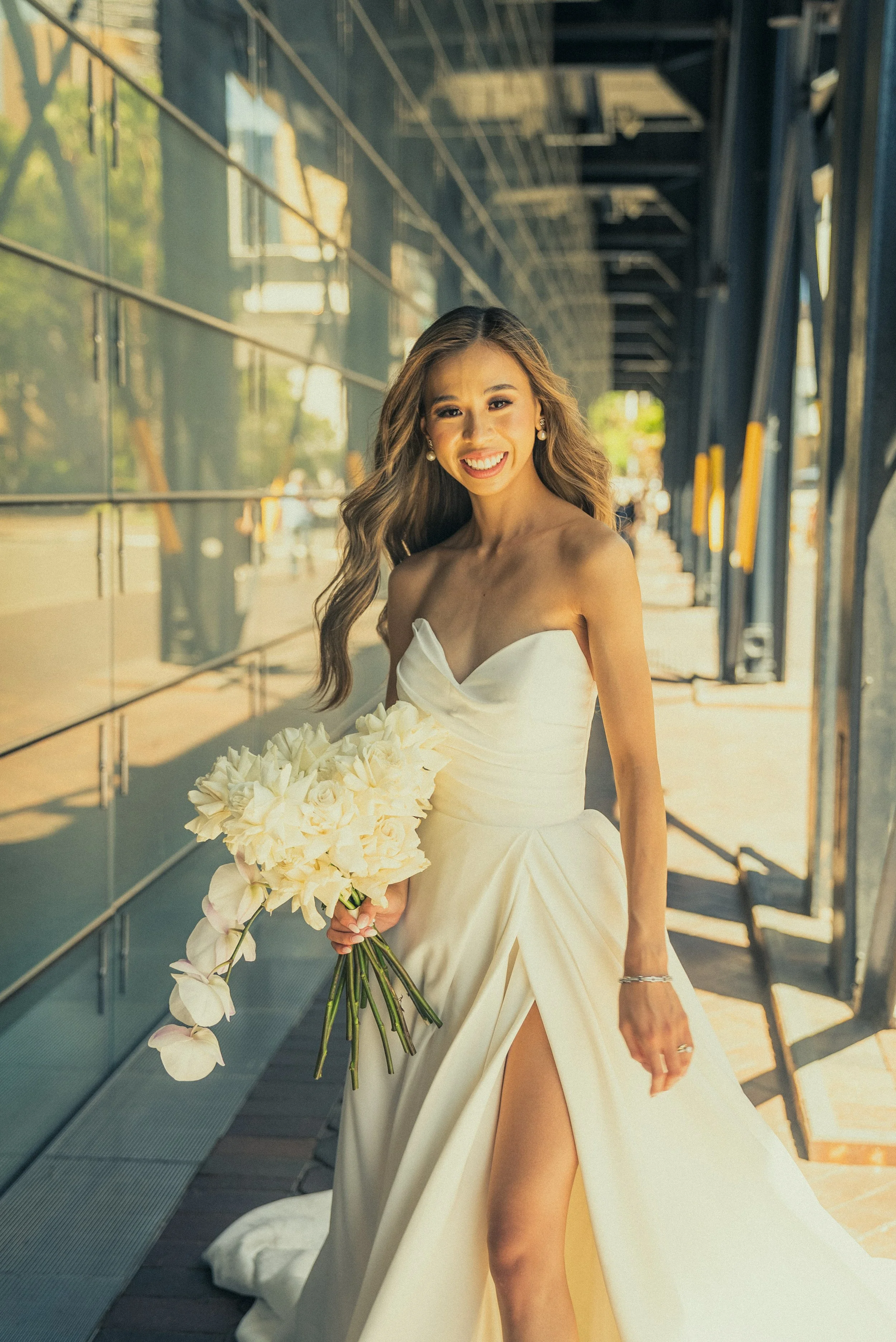 A smiling woman in a white wedding dress holding a bouquet of white flowers, standing outdoors near a reflective glass building.