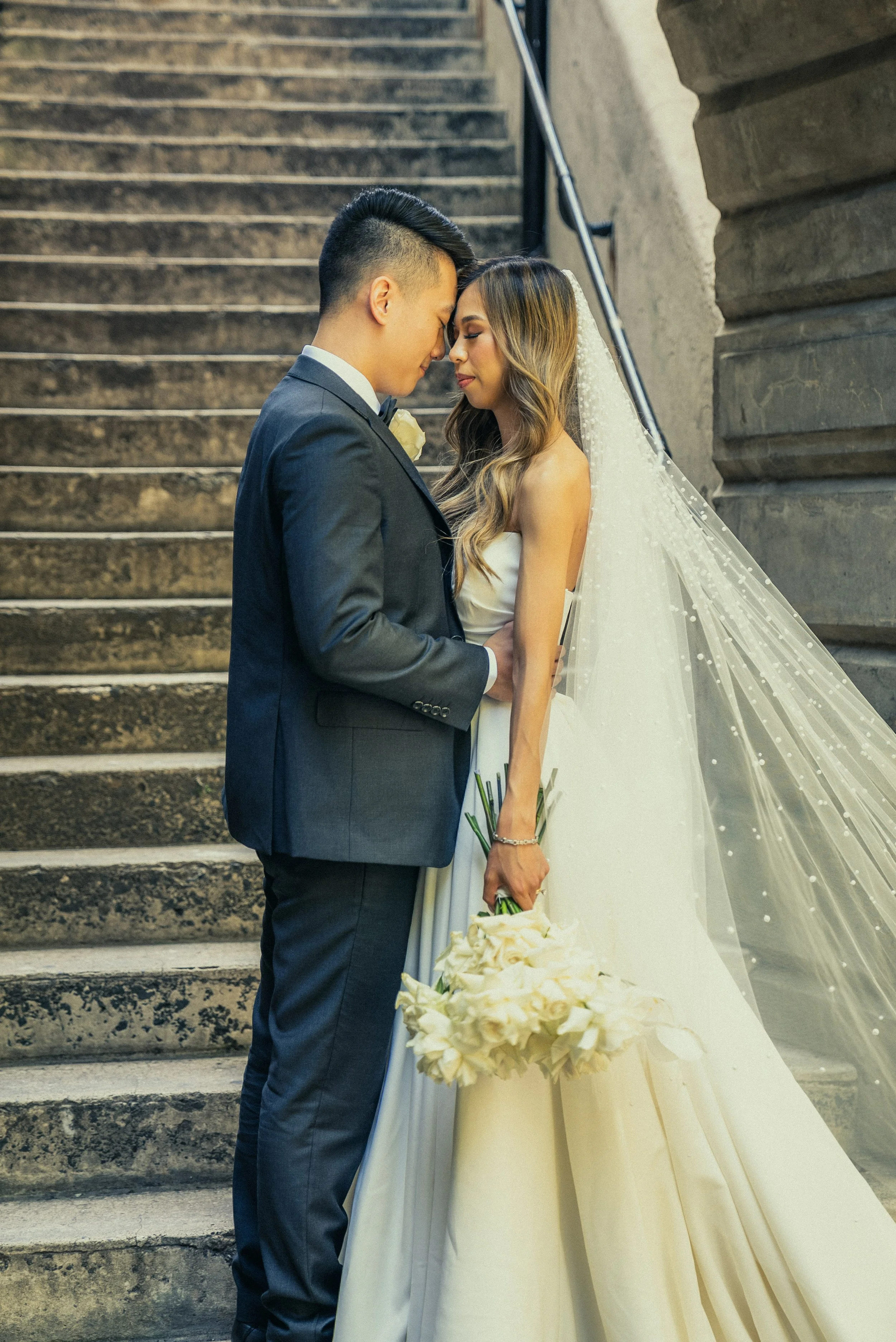 A bride and groom on a staircase, with foreheads touching, dressed in wedding attire. The bride is holding a bouquet of white flowers and wearing a white gown and veil. The groom is in a dark suit.