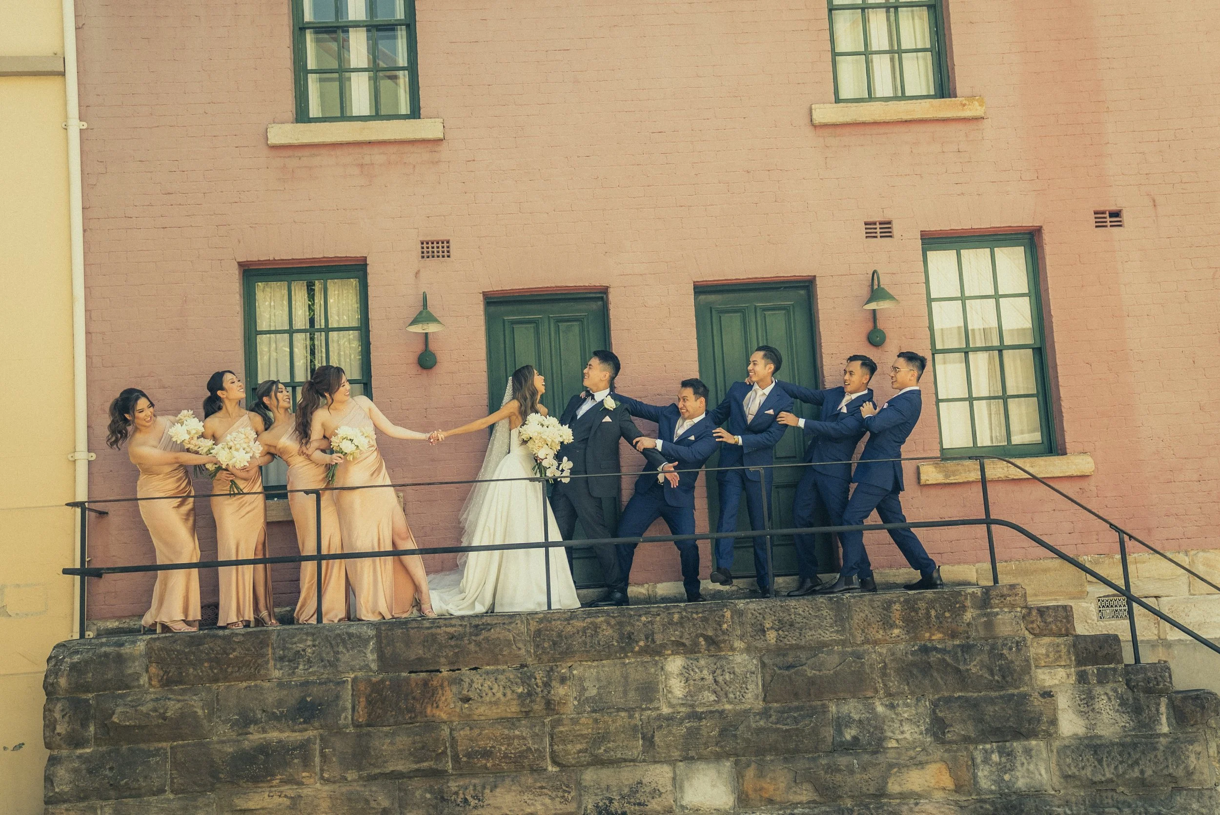 A wedding party of nine people standing on a stone ledge in front of a pink brick building. The bride and groom are in the center, holding hands and smiling, with the bride holding a bouquet. Four bridesmaids in matching peach dresses are on the left