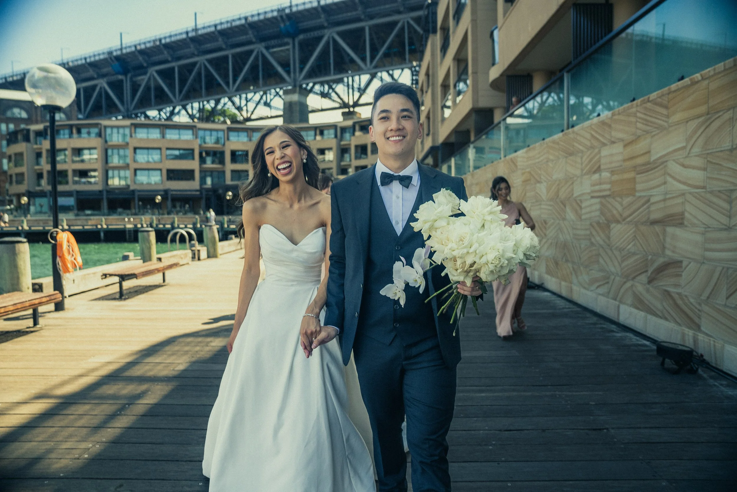A happy couple in wedding attire walking on a wooden pier by the water, with a modern building and a bridge in the background. The groom is holding a bouquet of white flowers.