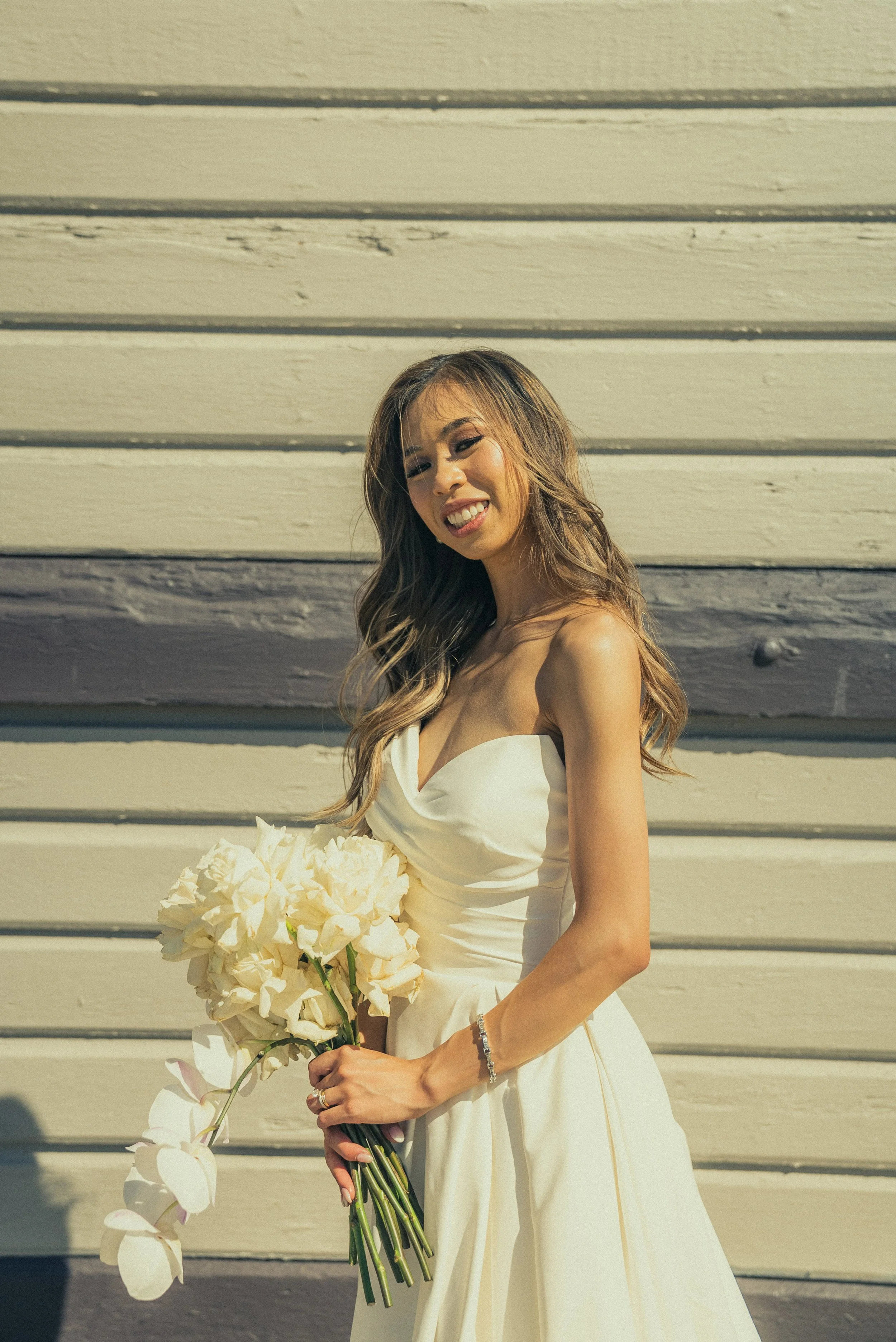 A woman in a white dress holding a bouquet of white flowers, standing against a beige wooden wall, smiling at the camera.