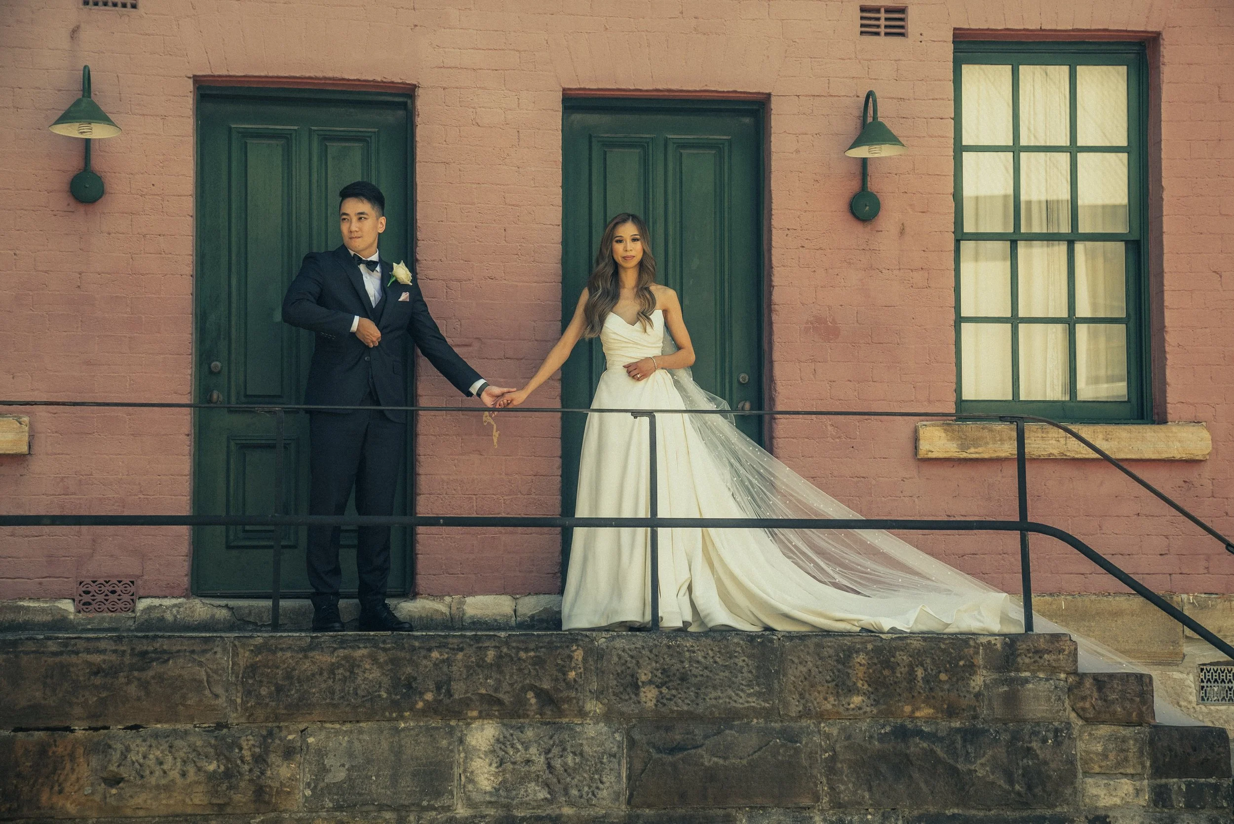 A bride and groom standing on a stone ledge in front of a pink brick building with green doors and windows. The groom is dressed in a dark suit with a white shirt and bow tie, holding the bride's hand. The bride is wearing a white wedding gown with a
