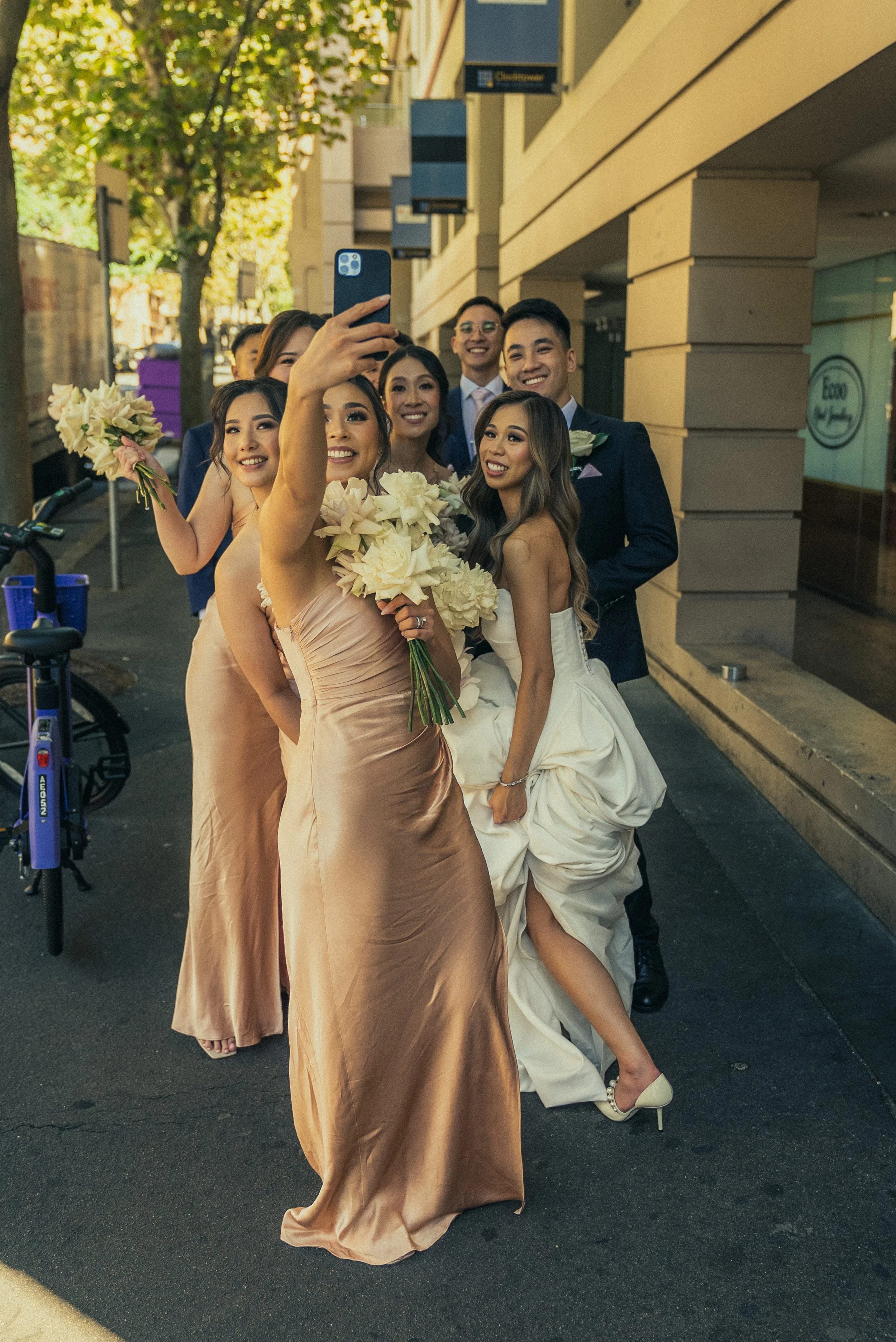 A group of wedding guests, including a bride holding a bouquet and wearing a white wedding gown, taking a selfie on the street with several friends dressed in formal attire, surrounded by trees and urban buildings.