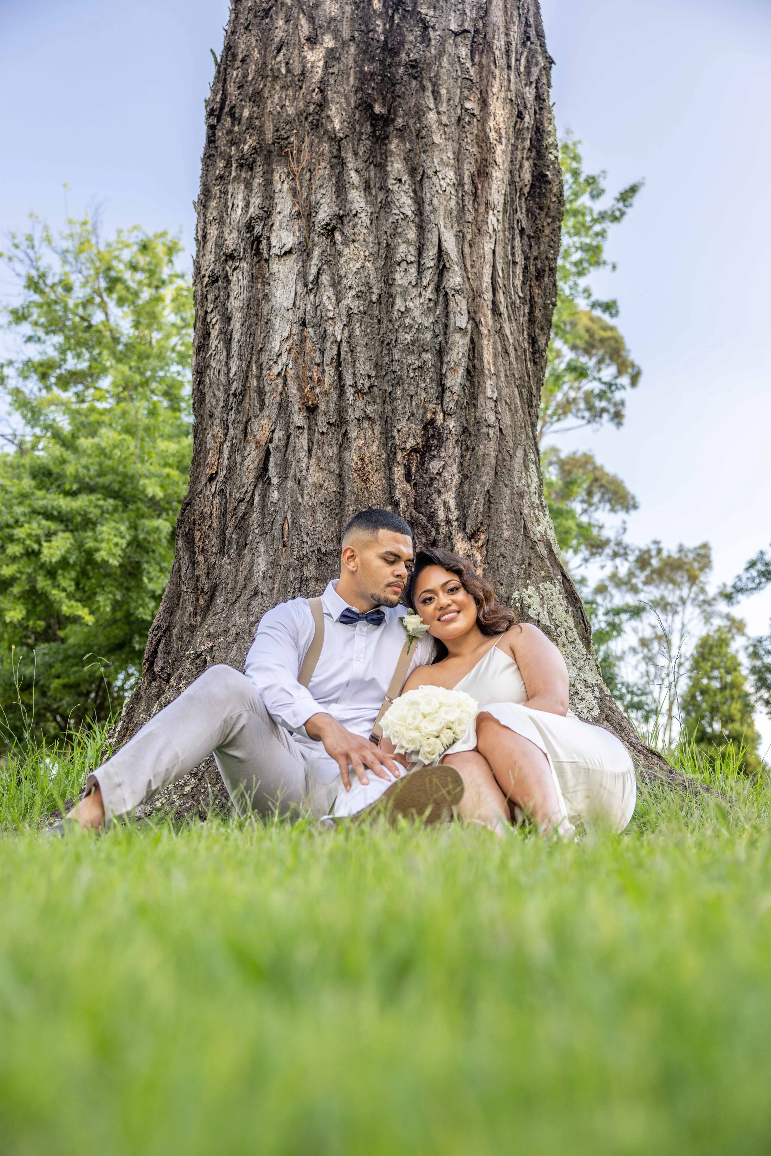 A couple sitting on the grass in front of a large tree, with the woman holding a bouquet of white roses and smiling, while the man looks down.
