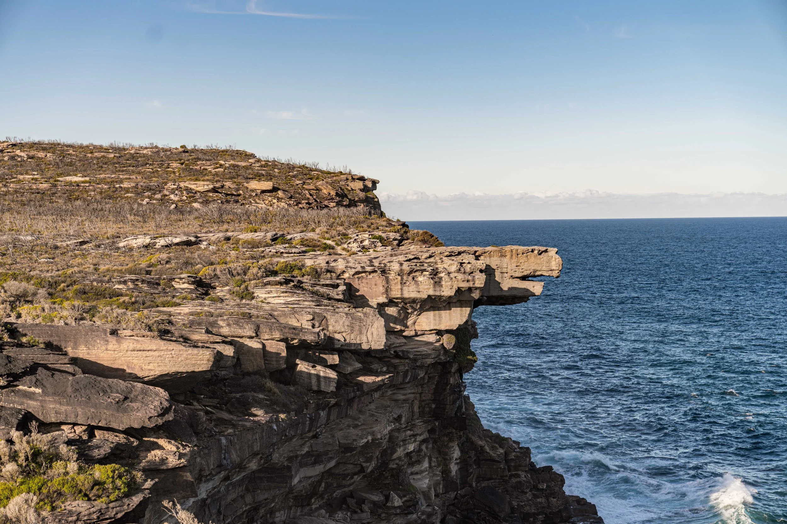 Cliffside with layered rocks extending into the ocean, under a clear blue sky.