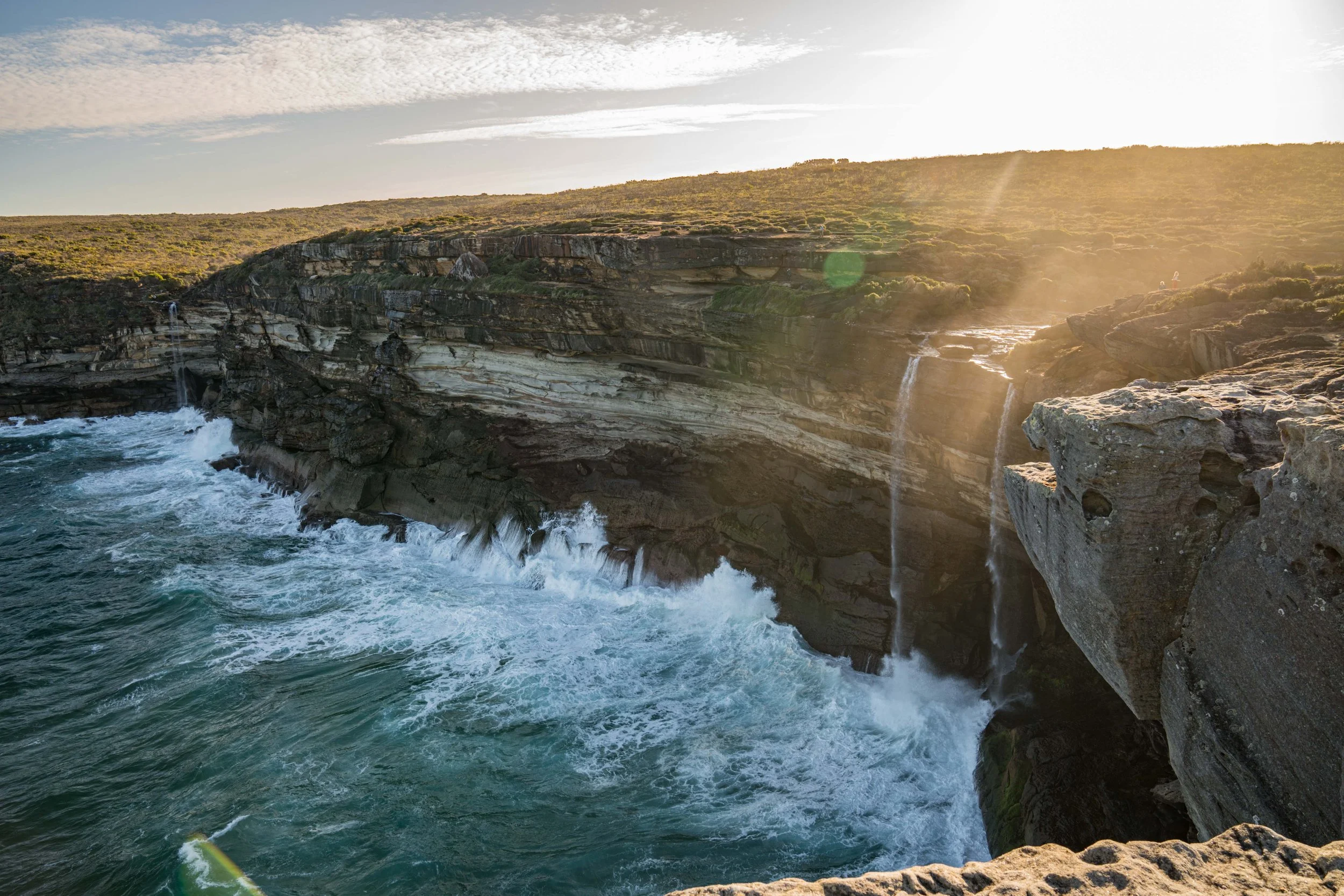 Sunset over rocky cliffs with waterfalls and ocean waves crashing against the shore.