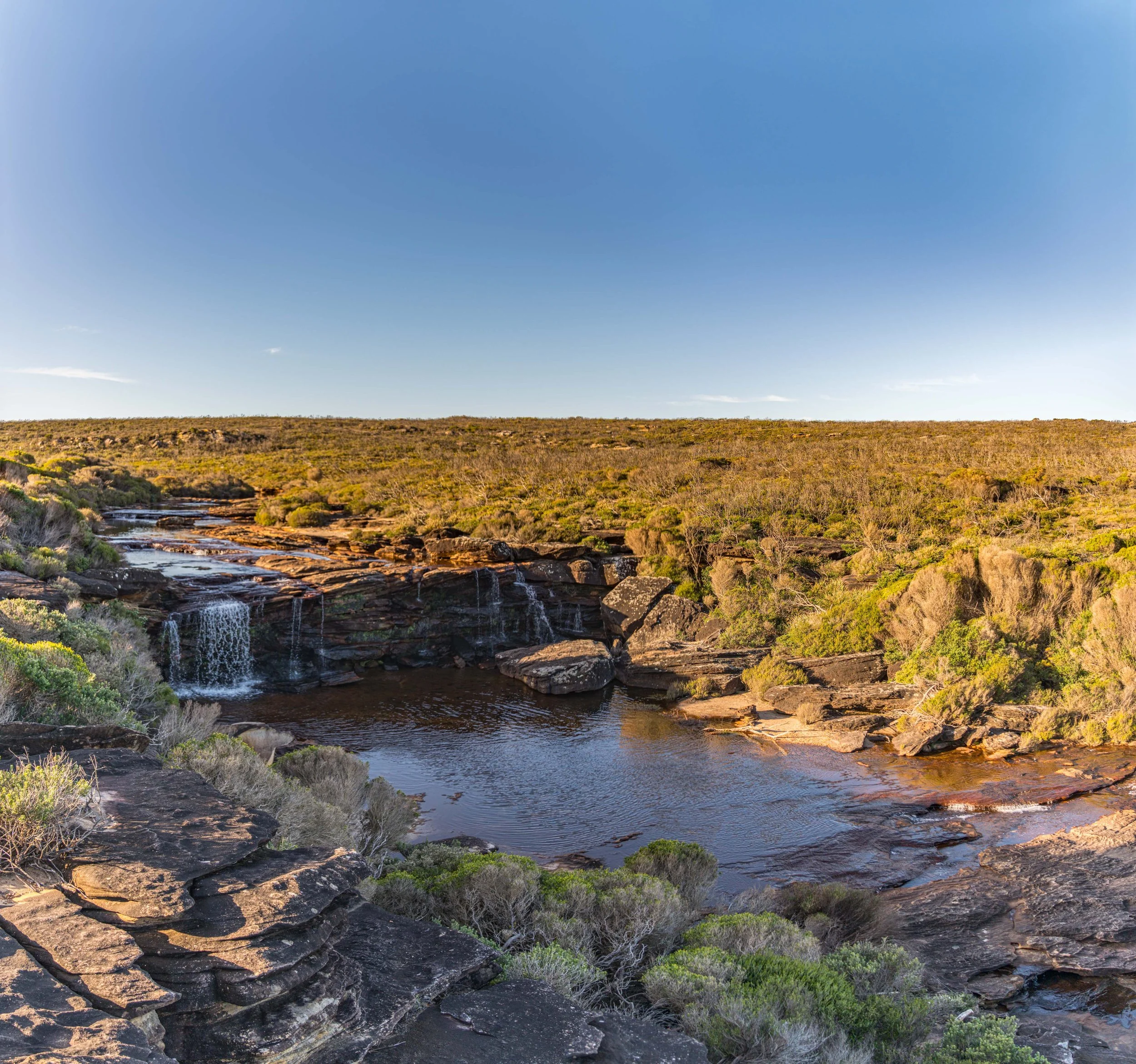 Scenic view of a small waterfall flowing into a calm river, surrounded by rocky terrain and lush vegetation under a clear blue sky.
