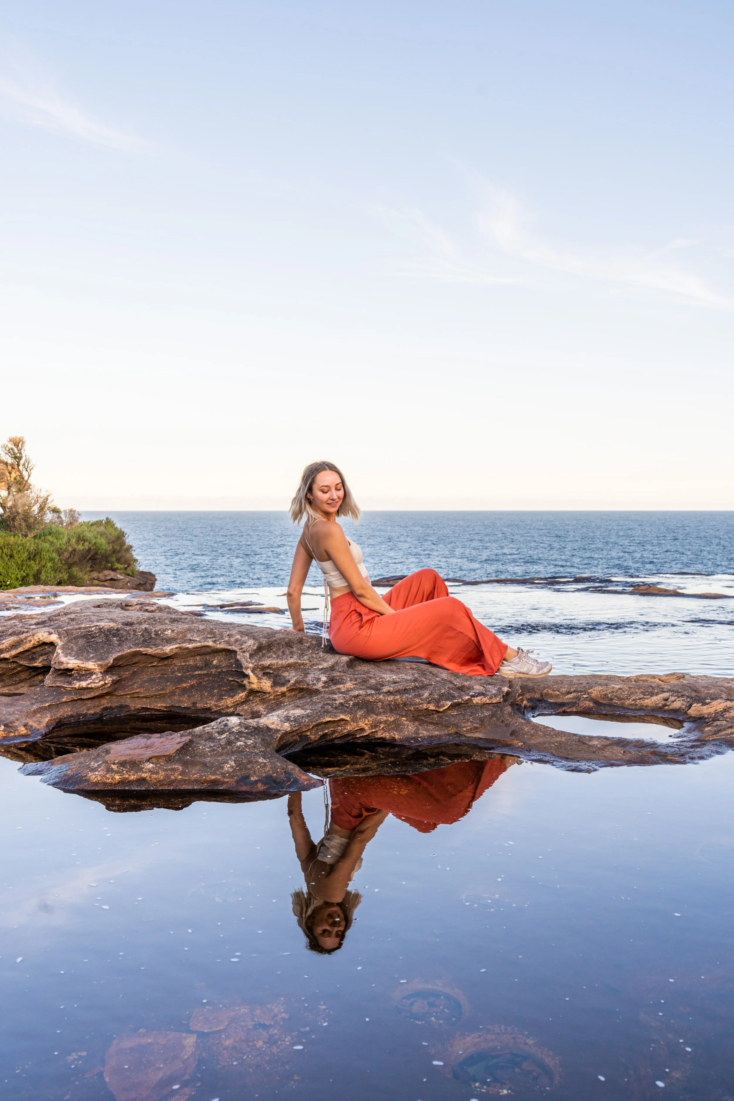 A woman sitting on rocks by the ocean, smiling and posing with her hand behind her head, with her reflection visible in a small pool of water.