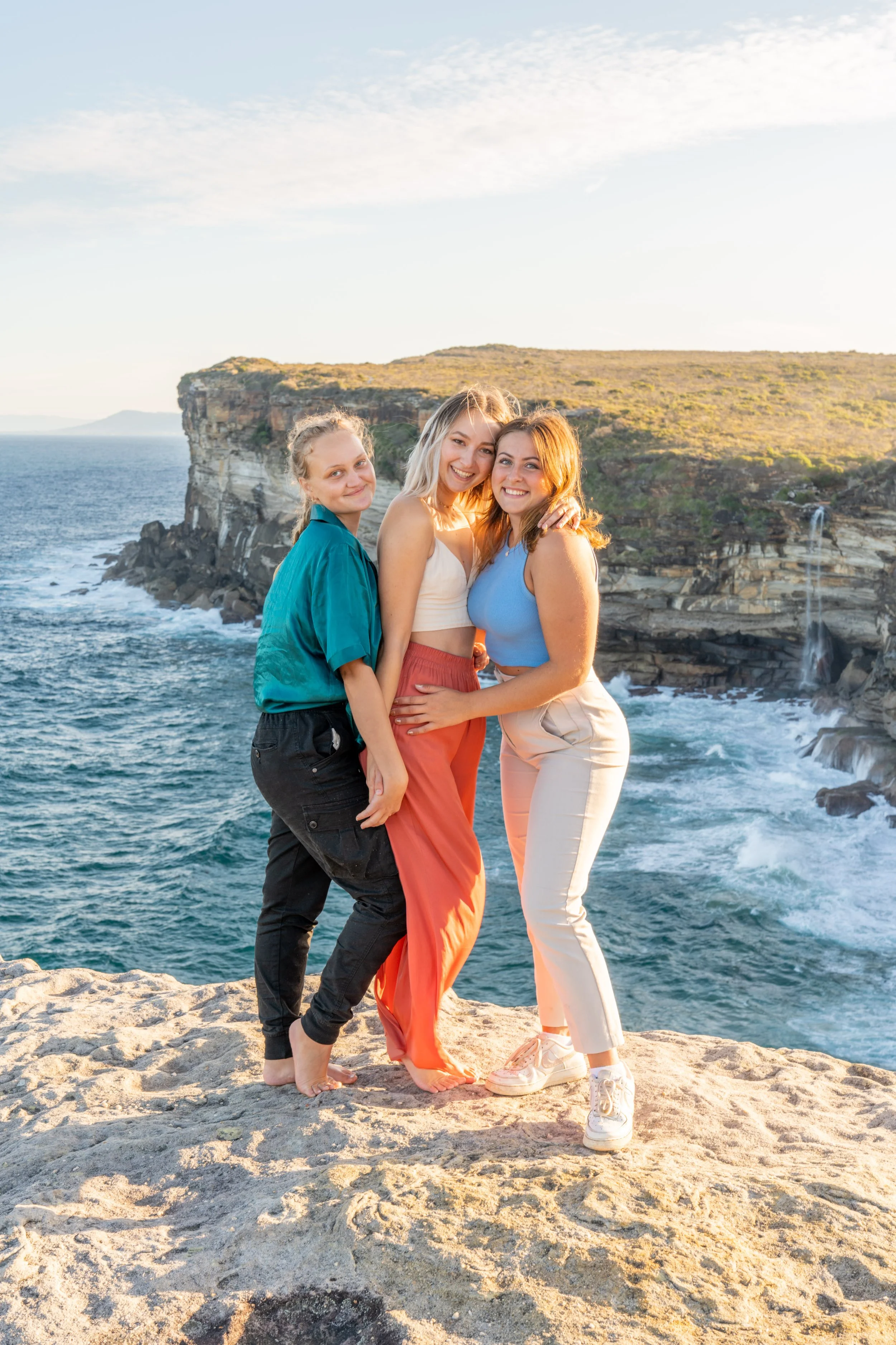 Three women standing close together on a rocky cliff edge, smiling and embracing each other with an ocean and cliff in the background during sunset.