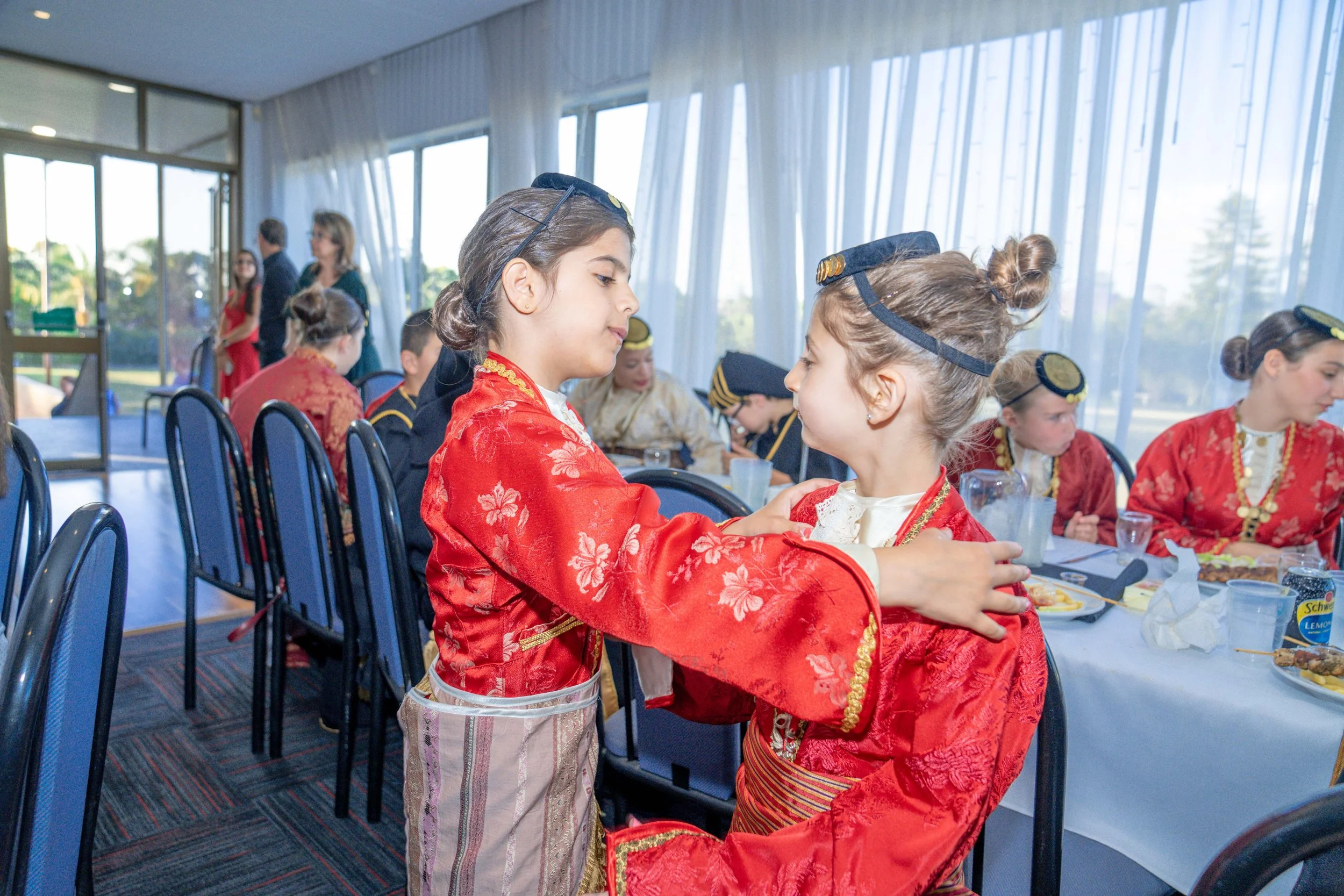 Young girls dressed in traditional costumes sit at a banquet table with plates of food, during an event inside a decorated hall, with other guests in the background.