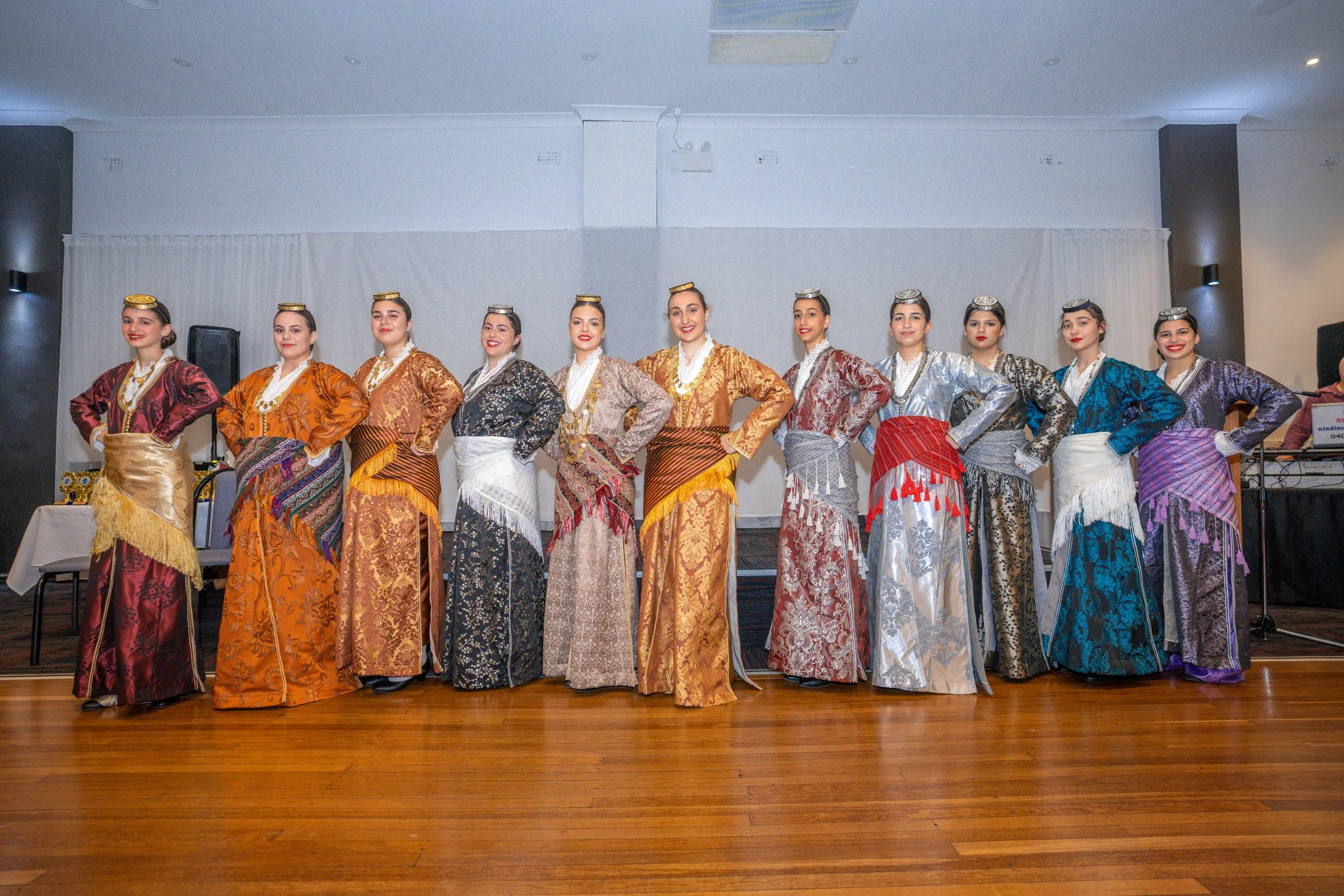 Group of women performing a traditional dance in colorful, ornate cultural costumes on a stage.