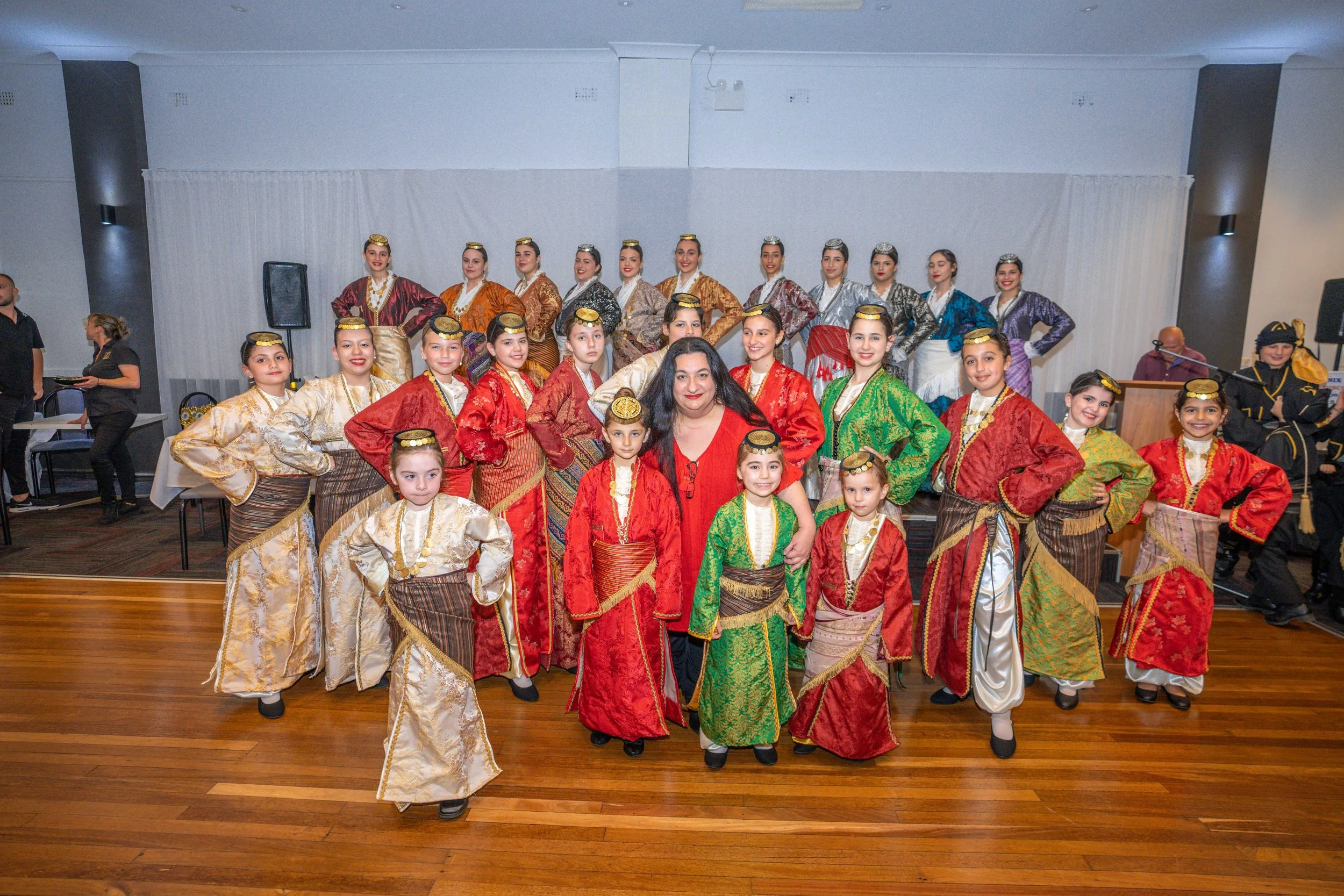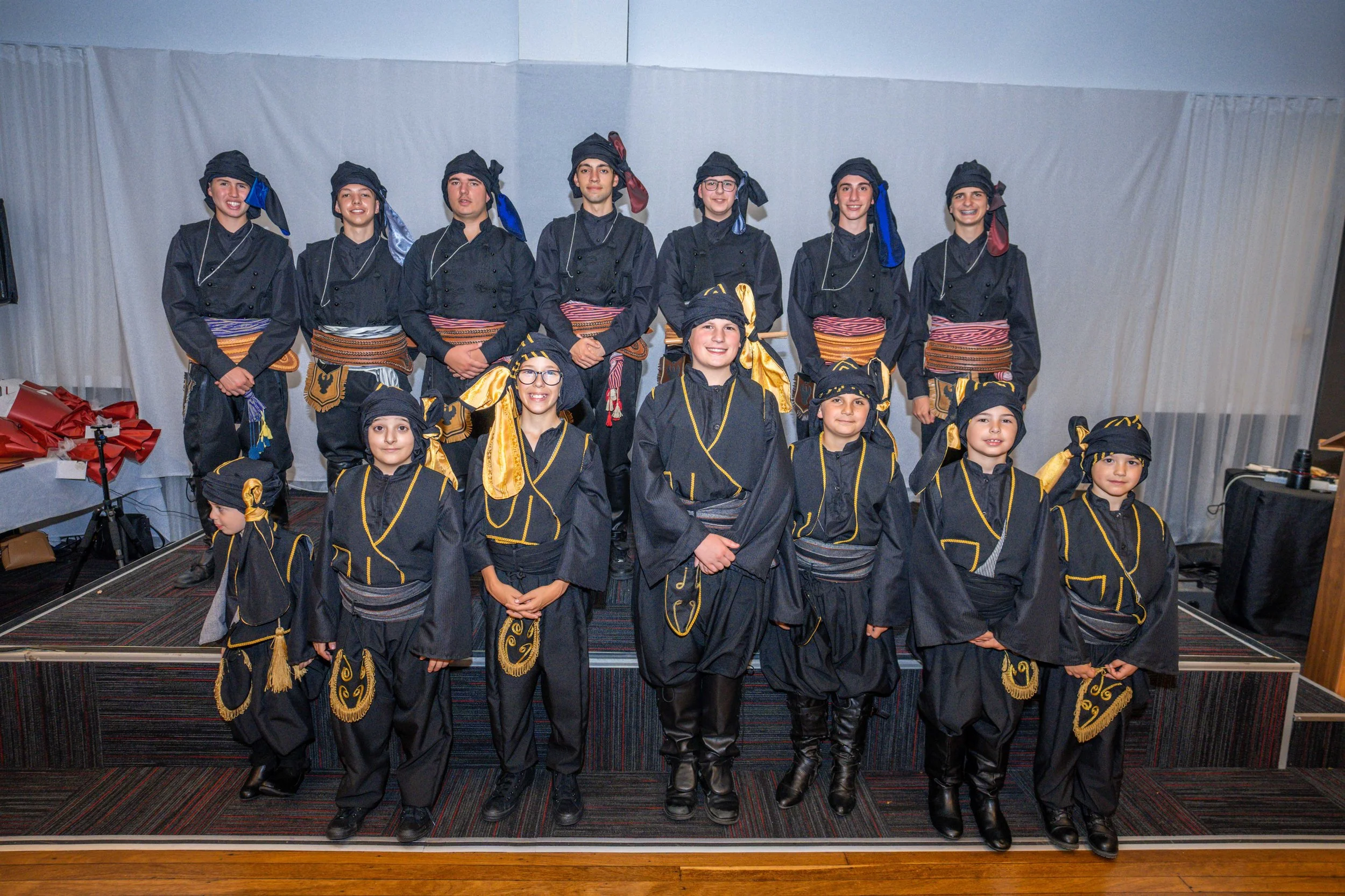 Group of children and teenagers in traditional Cretan costumes, standing on a stage, posing for a photo.